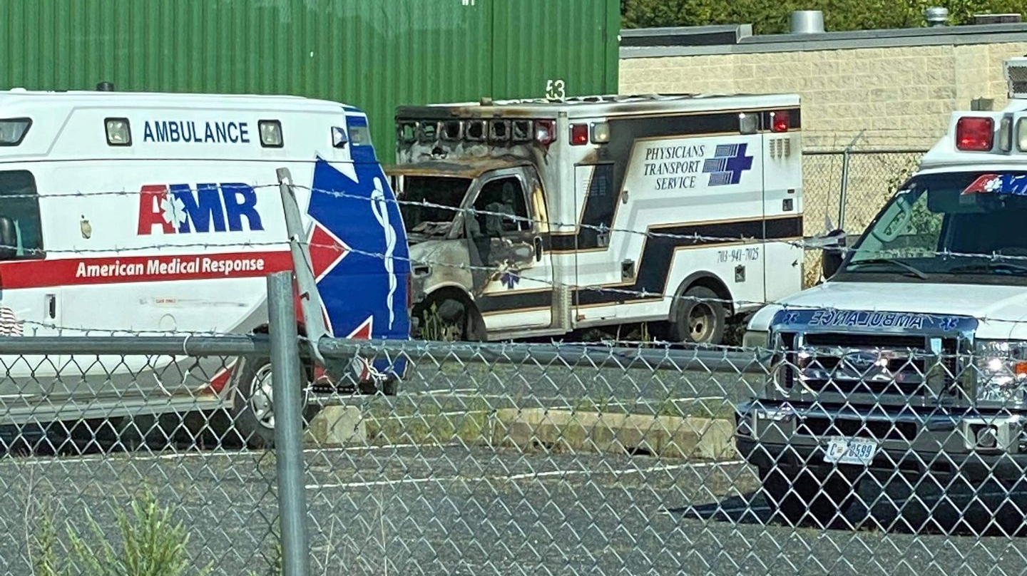 A burnt Physician's Transport Service ambulance, a small company that AMR bought out.